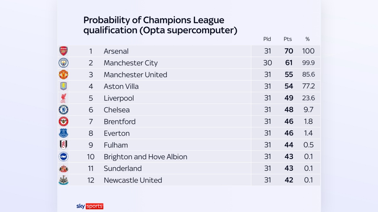 英超前四概率:曼联85.6%,维拉77.2%,利物浦23.6%,切尔西9.7%
